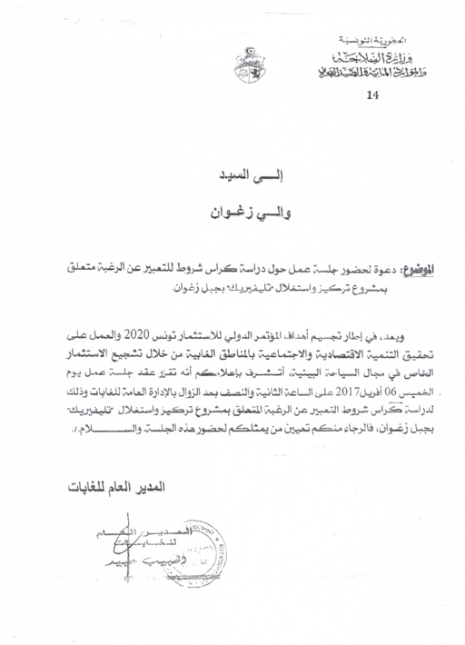 تبعا لزيارة السيد وزير الفلاحة والموارد المائية والصيد البحري لولاية زغوان يوم الجمعة 31 مارس 2017 وتبنّيه لمقترحات الجهة بخصوص عدد من المشاريع الهامة تقرّر عقد جلسة عمل يوم الخميس 06 أفريل 2017 بالإدارة العامة للغابات لدراسة كراس شروط التعبير عن الرغبة المتعلق بمشروع تركيز واستغلال تيليفيريك بجبل زغوان ليتم وضعه لاحقا على ذمة المستثمرين الخواص الراغبين في إنجازه المشروع المذكور.